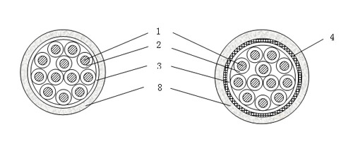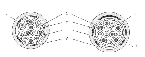 5--- 铜带屏蔽; 6--- 内护层; 7--- 钢带铠装; 8--- 聚烯烃护套